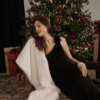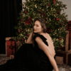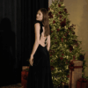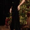 Плечи дополнены бархатными бантами — они смягчают линию открытой спины и добавляют образу театральность. Силуэт прямой, слегка приталенный, без жёсткого корсета. Длина макси — мягко касается пола. В движении чёрный бархат даёт выразительный световой перелив, особенно заметный в вечернем освещении и на фото.