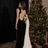Ключевой акцент — открытая спина, оформленная каскадом жемчужных нитей. Жемчуг собран в несколько уровней и воспринимается как часть конструкции платья, а не отдельное украшение: именно это переводит модель из категории «просто классика» в категорию вечерних statement-вещей.