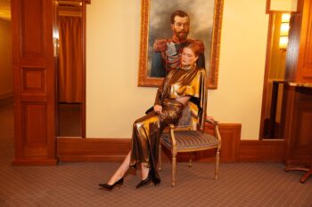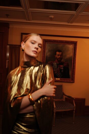 Вечерний костюм из металлизированной ткани с архитектурным топом и мягко драпированными брюками, построенный на эффекте движения, света и обнажённого пространства между формами.