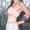 Персиковый оттенок близок к тону кожи и создаёт эффект «второй поверхности»: корсет выглядит мягко, интимно и очень светло. Он подчёркивает ключицы, шею и плечи, работая не как акцент, а как продолжение образа.