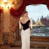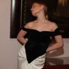 Верх выполнен в чёрном цвете, с чёткой корсетной конструкцией и открытой линией плеч. Глубокий, выверенный вырез формирует линию ключиц и шеи. Корсет не декоративный: он задаёт форму и держит вертикаль силуэта.