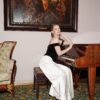 Вечернее платье с контрастной корсетной верхней частью и драпированной юбкой, построенное на балетной архитектуре и строгой симметрии.